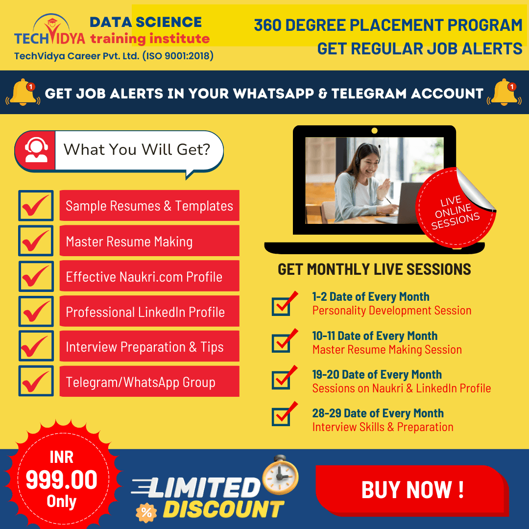 Get 360° Career Support – Online live sessions on Resume Making, Interview Preparation, Personality Development, Naukri & LinkedIn Profile Creation along with Frequent Data Science Job Alerts via our Premium WhatsApp Group.
